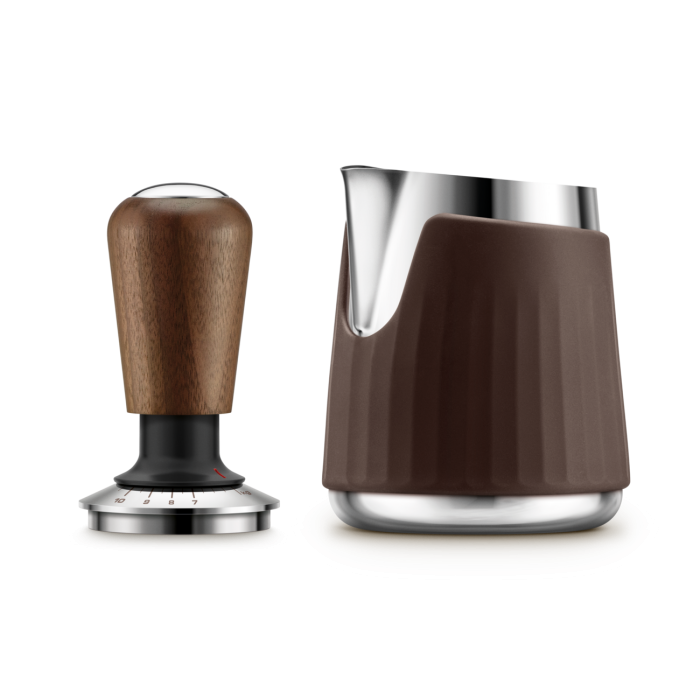 The Force Gauge self-leveling tamper provides consistent pressure with minimal effort. The Pro Control Jug™, features a handleless design with a pro spout that gives you full control to create more precise latte art. Compatible with 54mm Breville Espresso Portafilters.