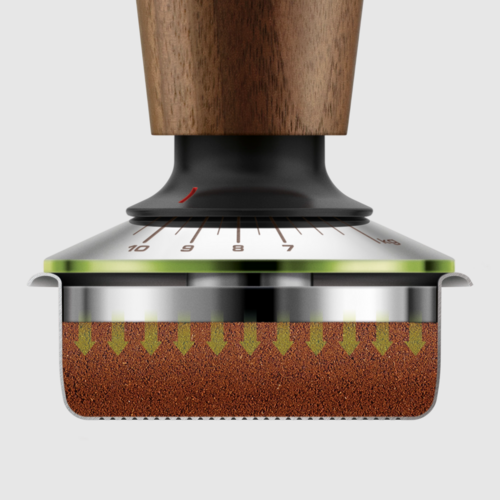 Spring-loaded mechanism provides consistent pressure between 7 kg and 10 kg. The variable force gauge has marking indicators to let you select your preferred tamp force to the grind.